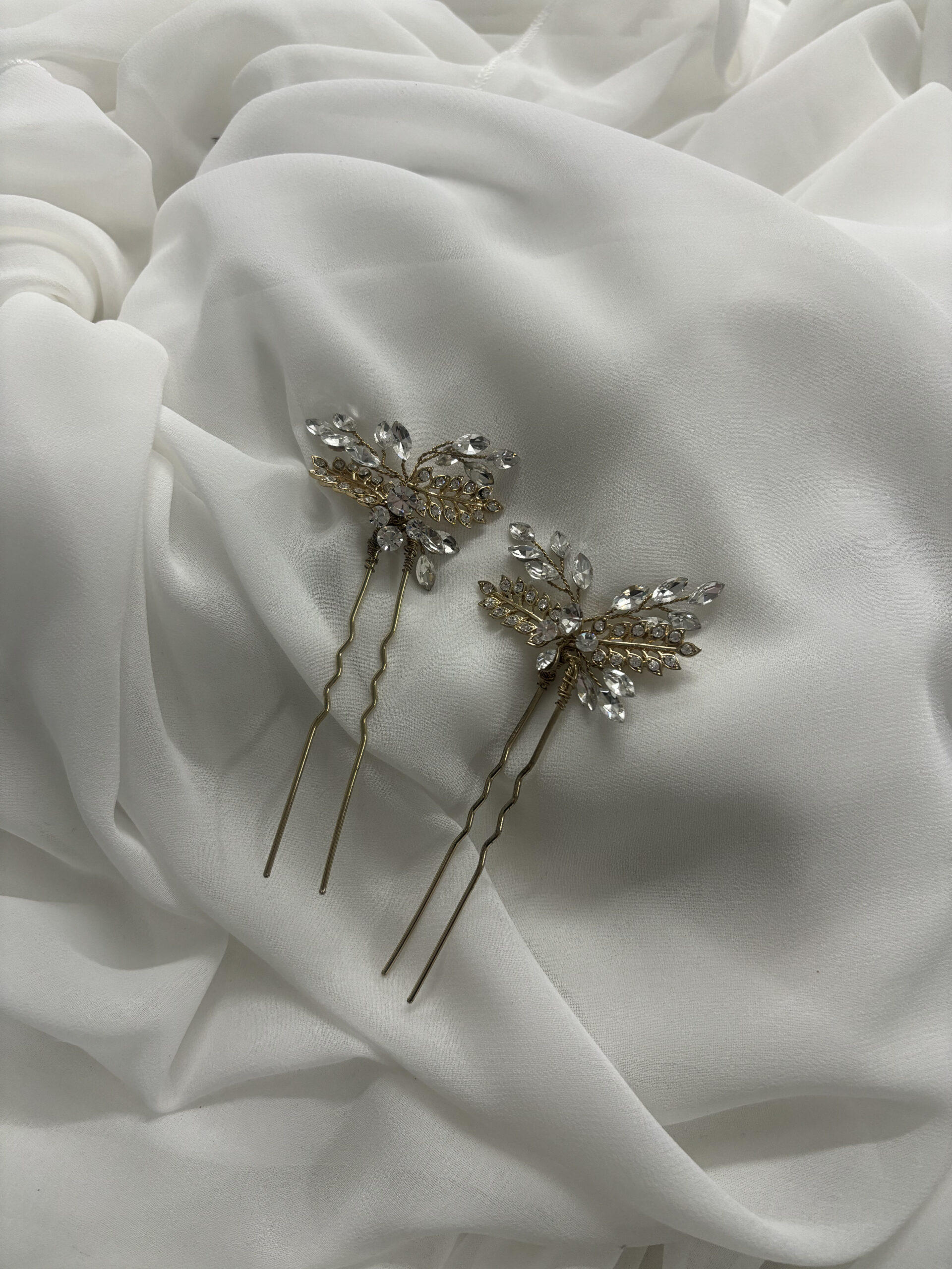 Horquillas para el pelo hojas Dorada con pedrería y perlas.