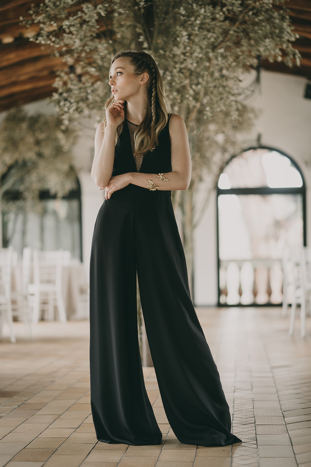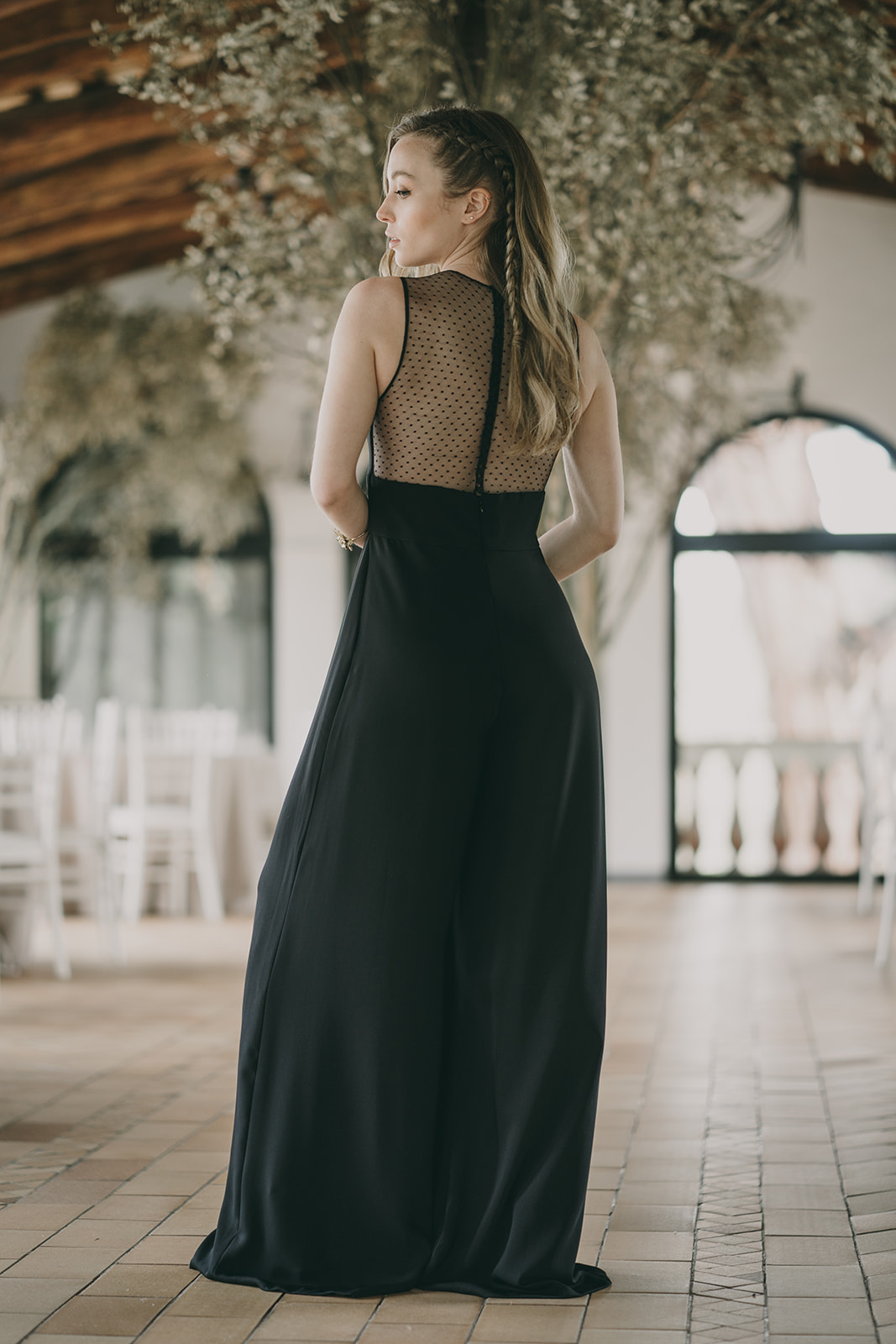 Nuestro Mono Iris se compone por un diseño elegante de crepe negro con escote de plumety.