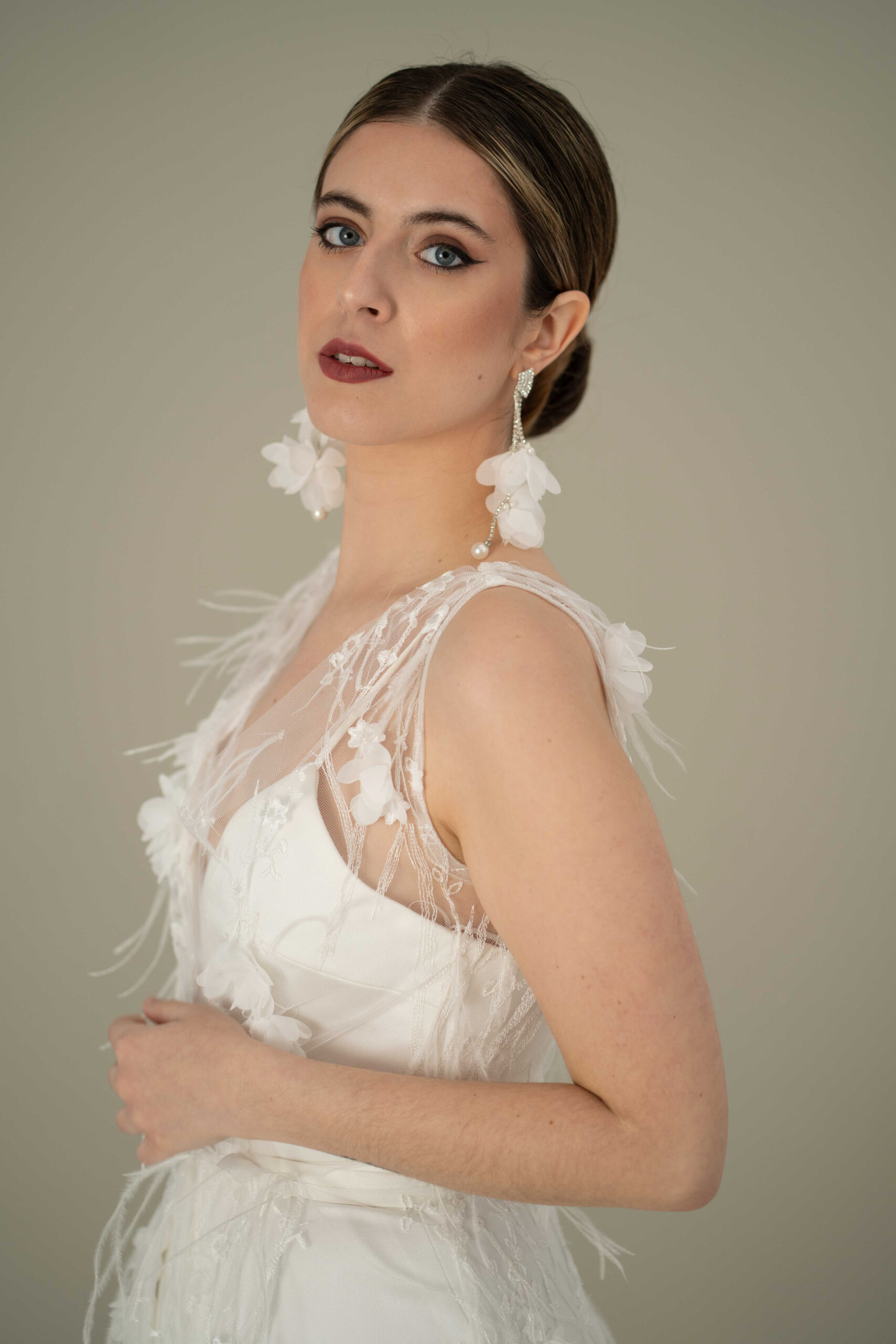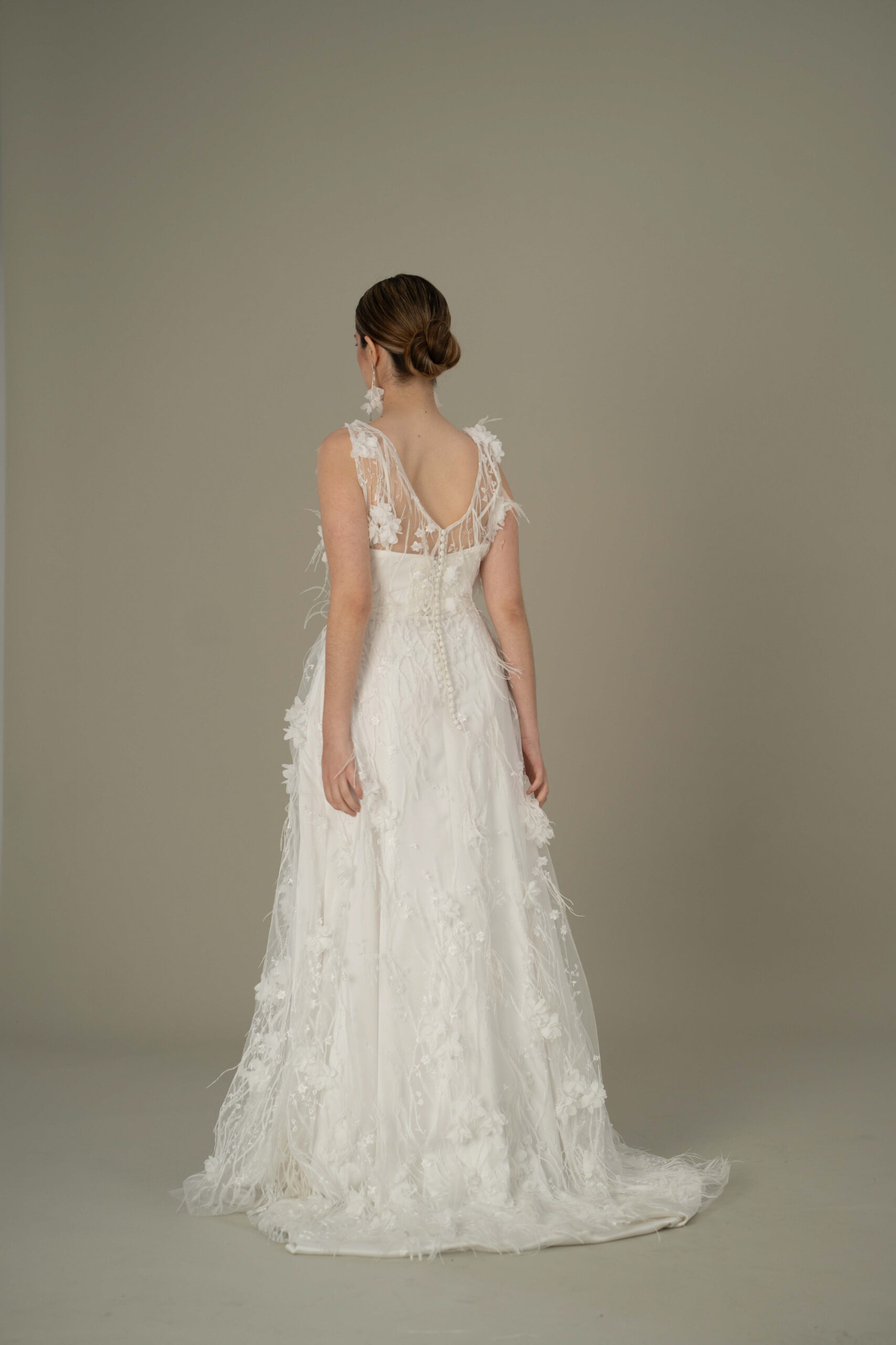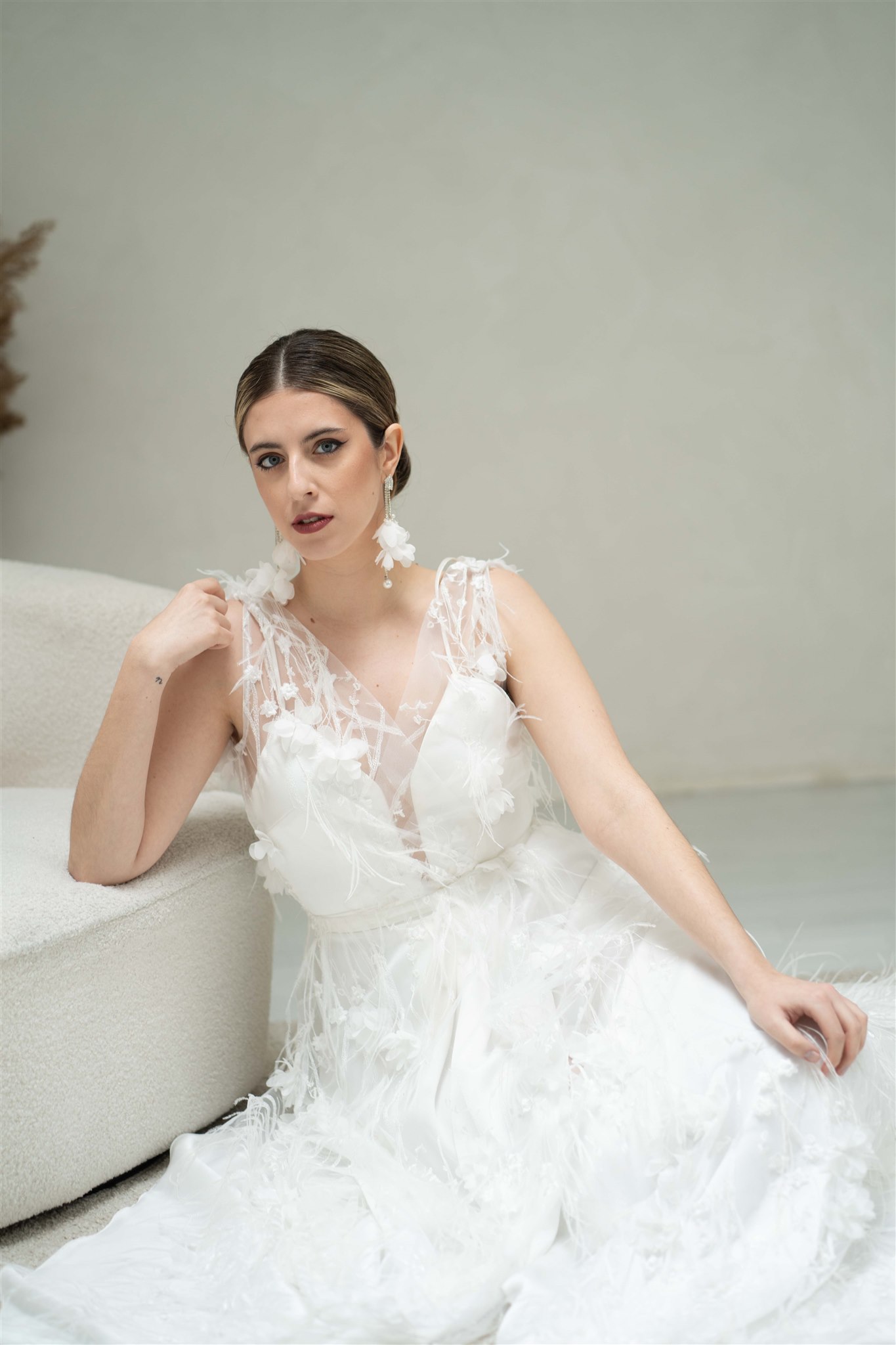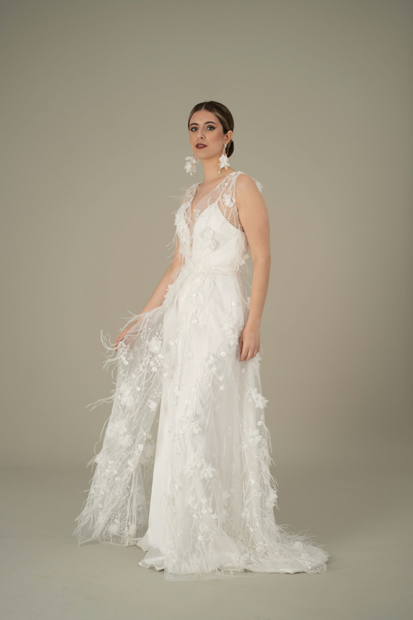 Nuestro Conjunto Rubí de la colección Albedrío ,Vestido de Novia con tejido fantasía de plumas y flores 3D.